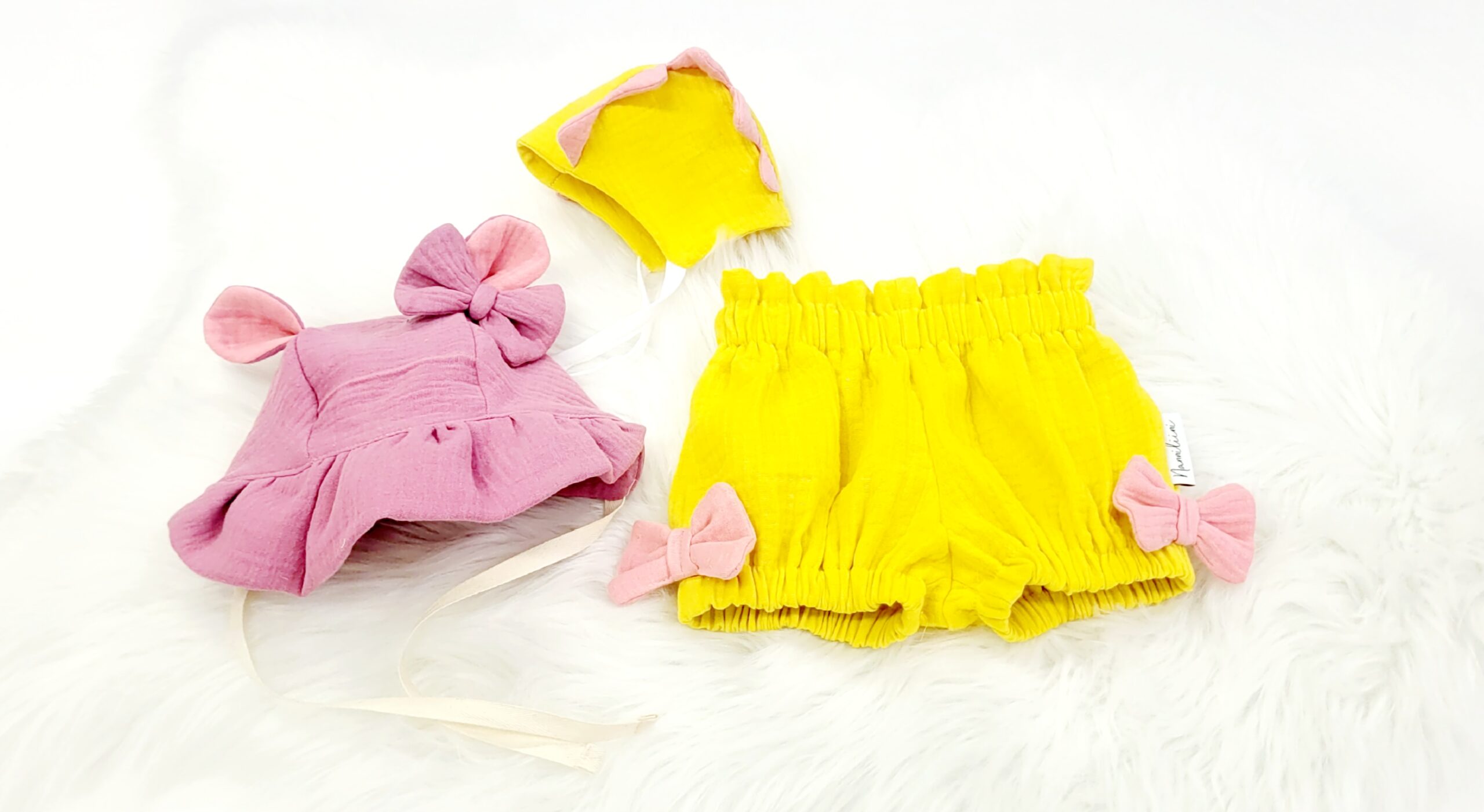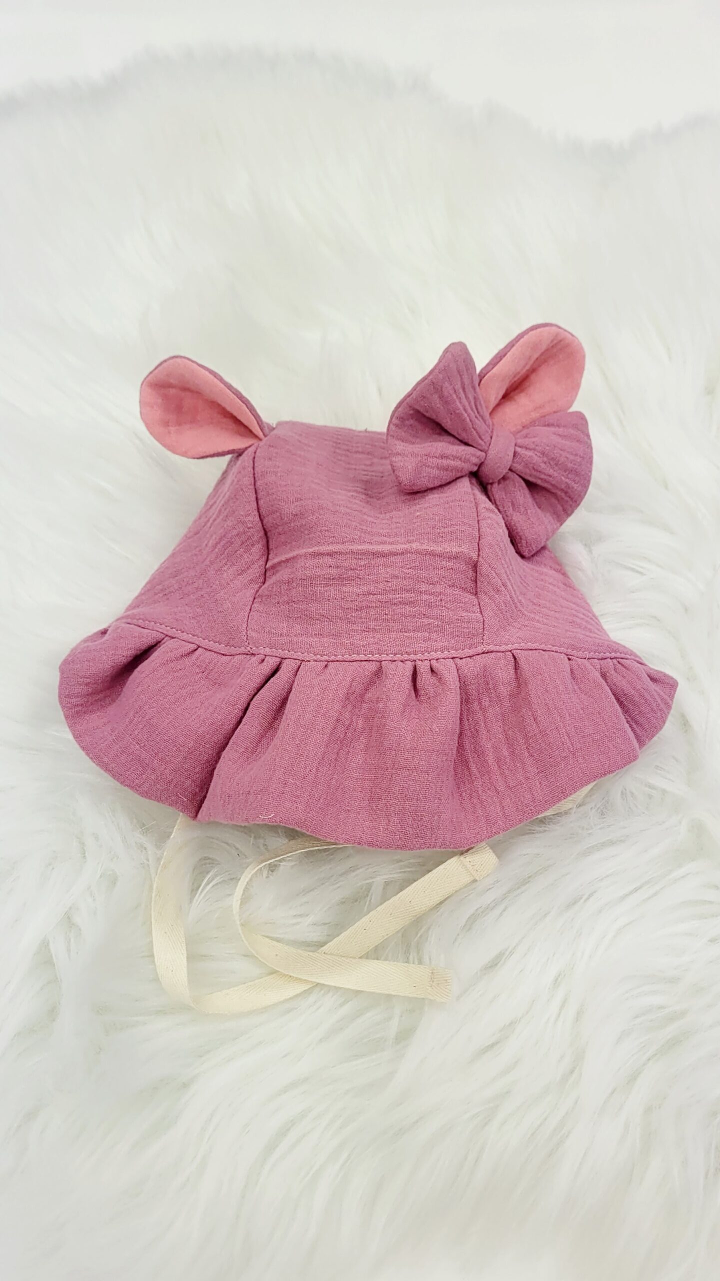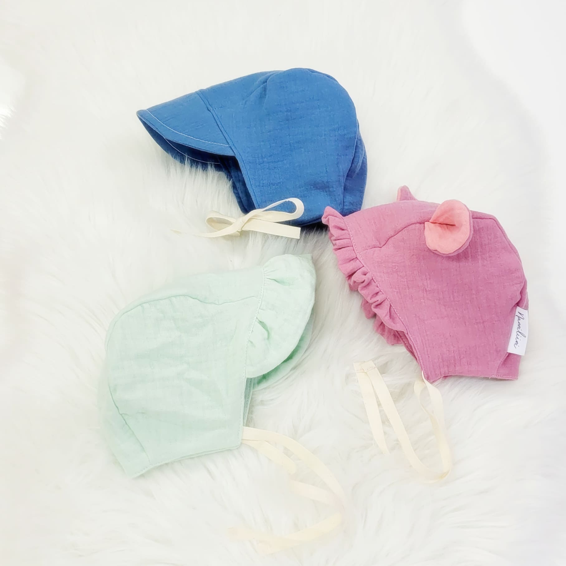 Double gauzesta tehty bonnet on ihanan ilmava sekä pehmeä materiaali perheen pienimmille, se 100% puuvillaa. Se on huoleton huoltaa,sitä ei tarvitse silitellä vaan se saa olla rennon rypyssä.