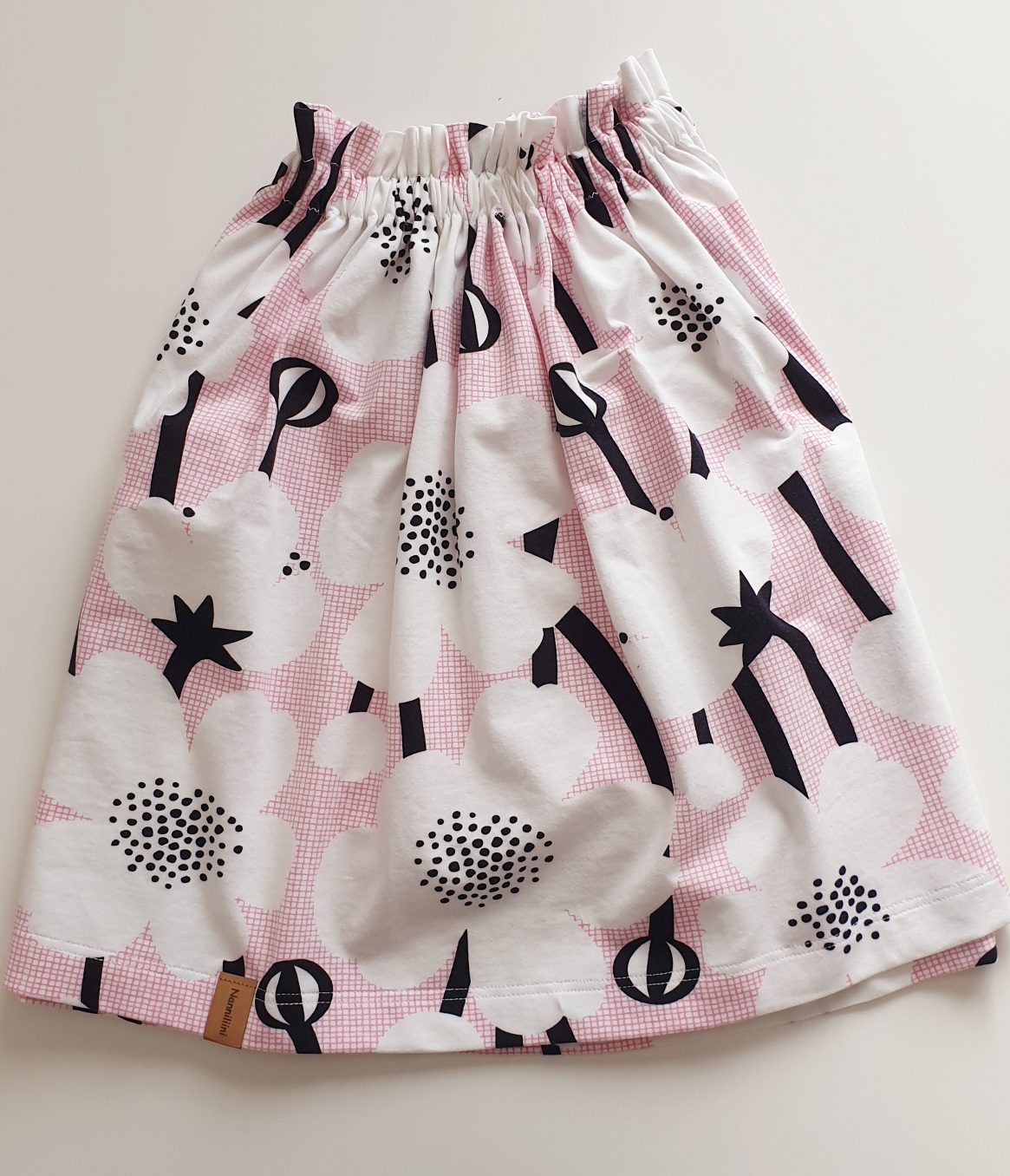 Trikoinen hame paperbag vyötäröllä, 122 cm. Vyötärömitta n. 26 cm.